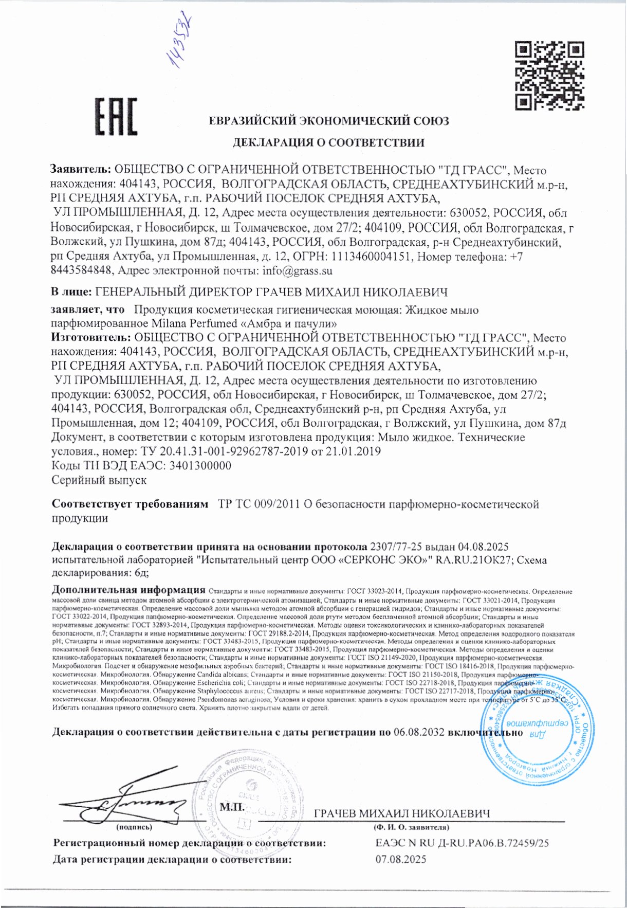 Жидкое Мыло Grass Milana Парфюмированное Амбра и Пачули 1л