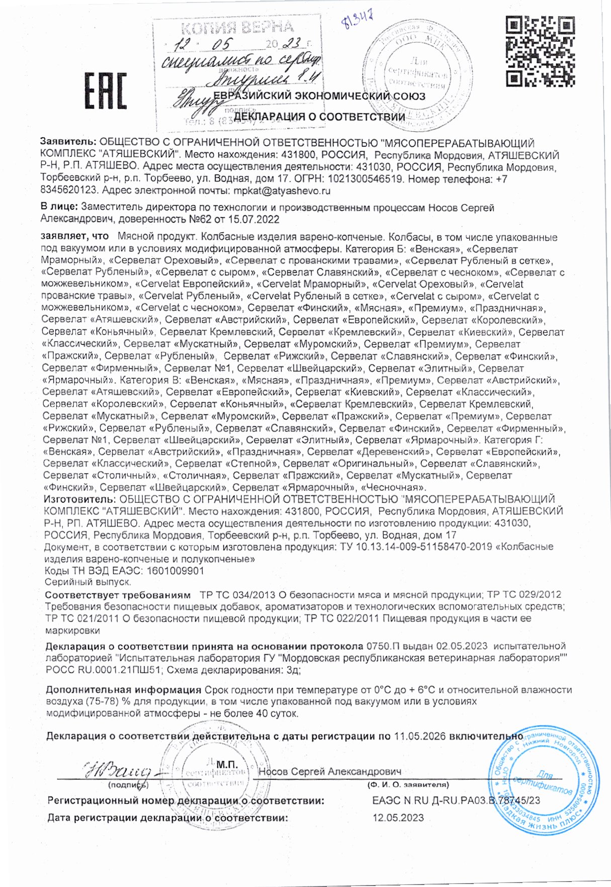 Сервелат Кремлёвский 350 гр в/у Атяшевский Мпк
